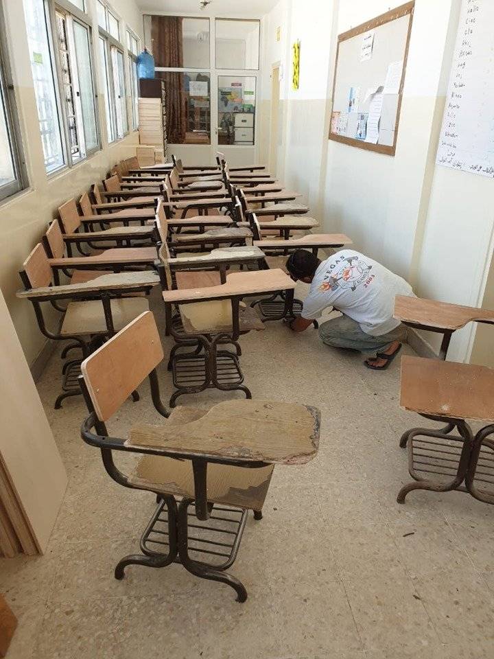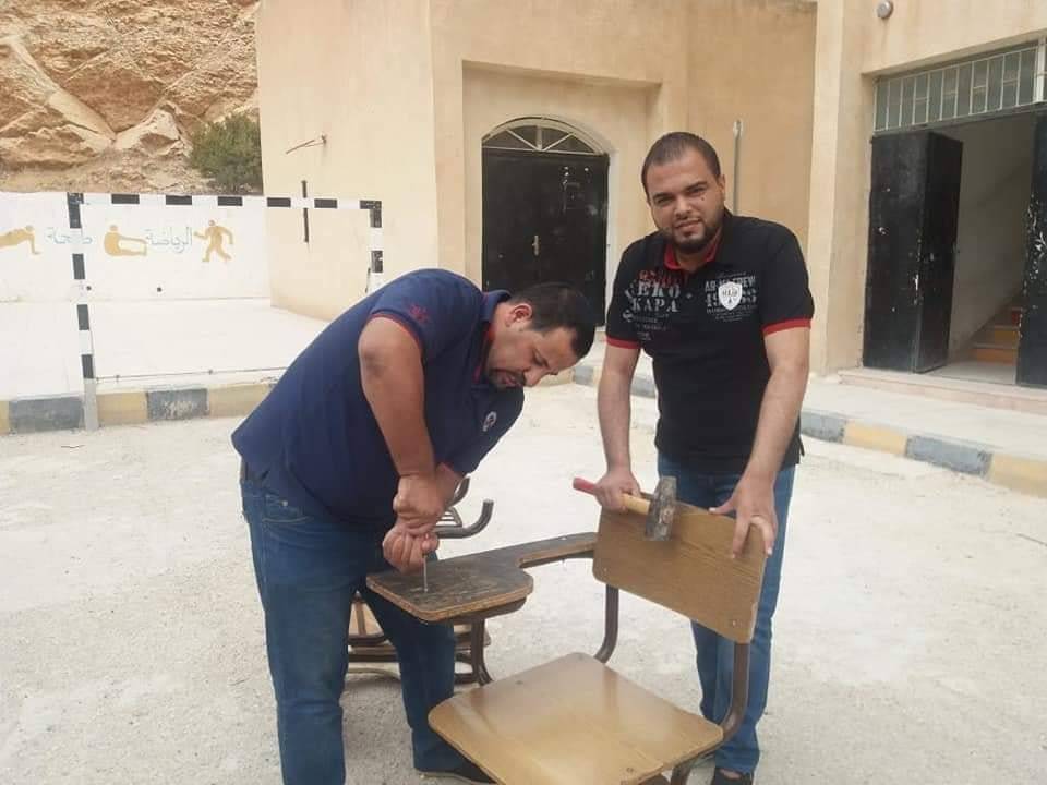 وأقدم معلمو مدرسة كفر الماء الاساسية الثانية للبنين، في لواء الكورة بإربد، إضافة إلى معلمين في مدرسة الملك عبدالله الثاني للتميز بالمفرق، على المباشرة بأعمال الصيانة للغرف الصفية والمقاعد والجدران الخارجية.