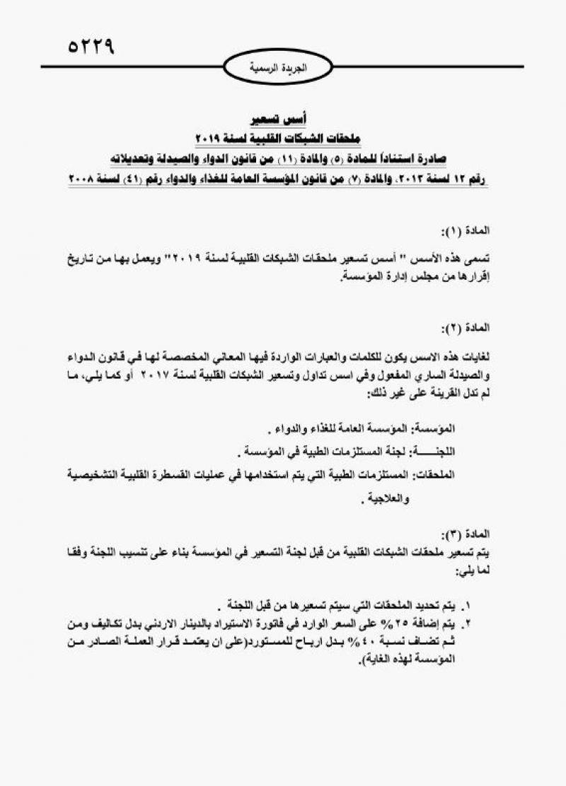 وبحسب أسس تسعير ملحقات الشبكات القلبية لسنة 2019 المنشورة في الجريدة الرسمية فإنه تضاف نسبة 40 % بدل أرباح للمستورد.