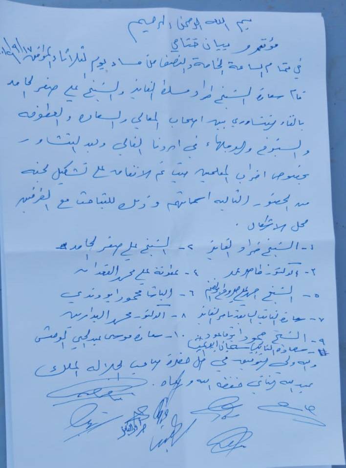 وبعد التشاور، والتباحث، تم الاتفاق على تشكيل لجنة يمثلها 11 شخص من الحضور لإيجاد انسب الحلول والطرق لإنصاف الطرفين والوصول إلى حلول للإشكالية القائمة والمتمثلة باستمرار اضراب المعلمين الذي يطالبون بعلاوة الـ50%.