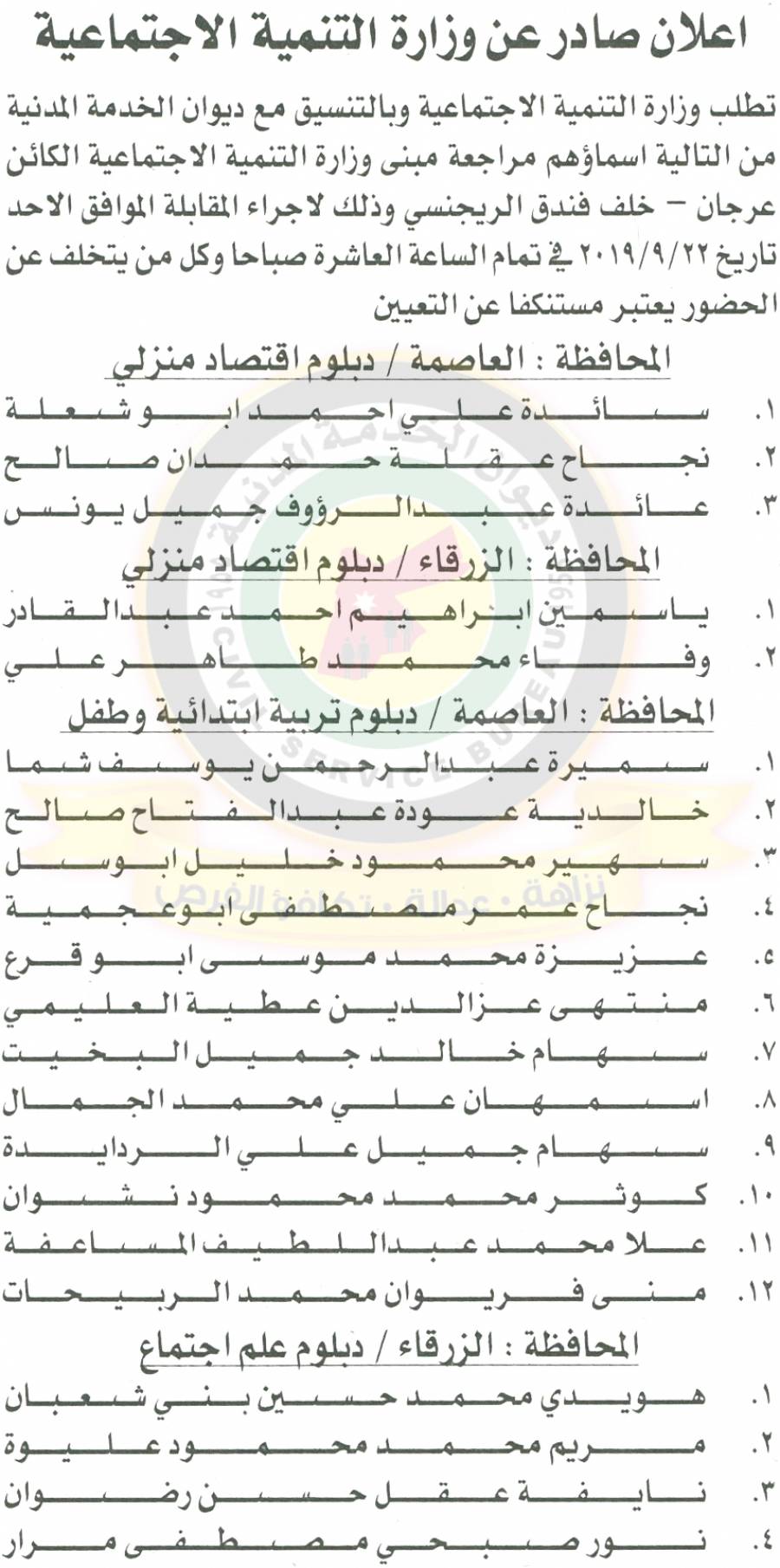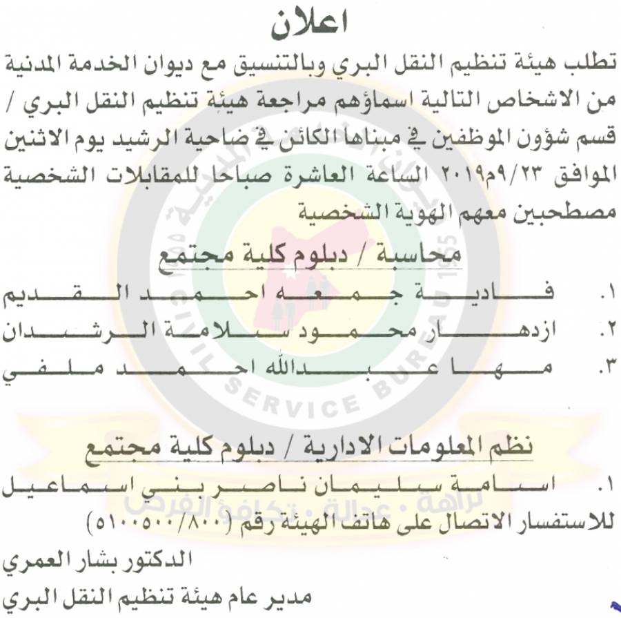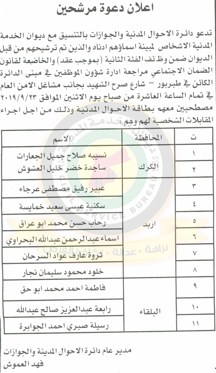 نيروز الاخبارية :دعا ديوان الخدمة المدنية بالتعاون مع مختلف الوزارات والمؤسسات الحكومية، التالية اسماؤهم لاجراء المقابلات الشخصية وعقد الامتحان التنافسي لغايات التعيين.