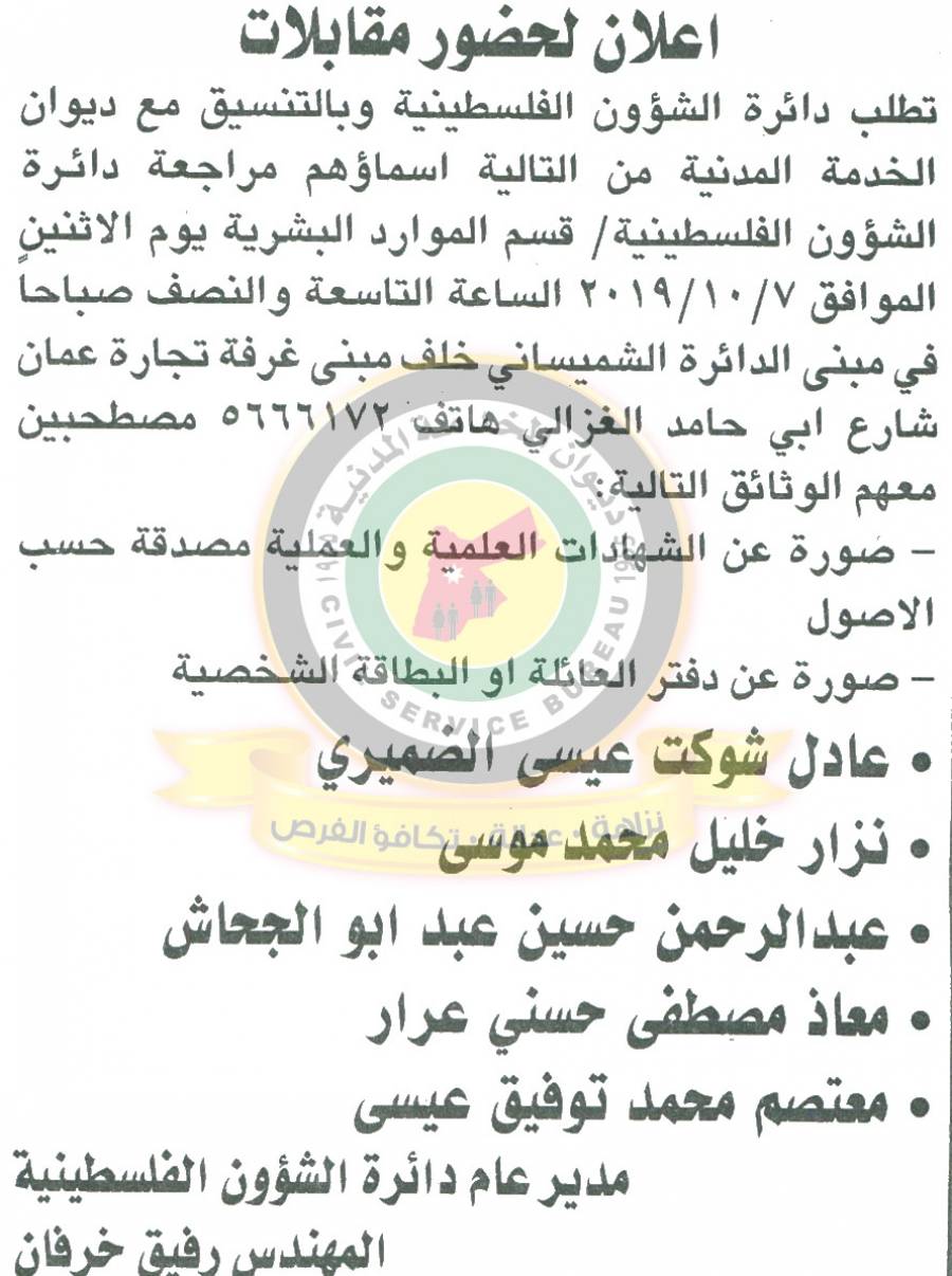 نيروز الاخبارية: دعا ديوان الخدمة المدنية بالتعاون مع مختلف الوزارات والمؤسسات الحكومية، التالية اسماؤهم لاجراء المقابلات الشخصية وعقد الامتحان التنافسي لغايات التعيين.
