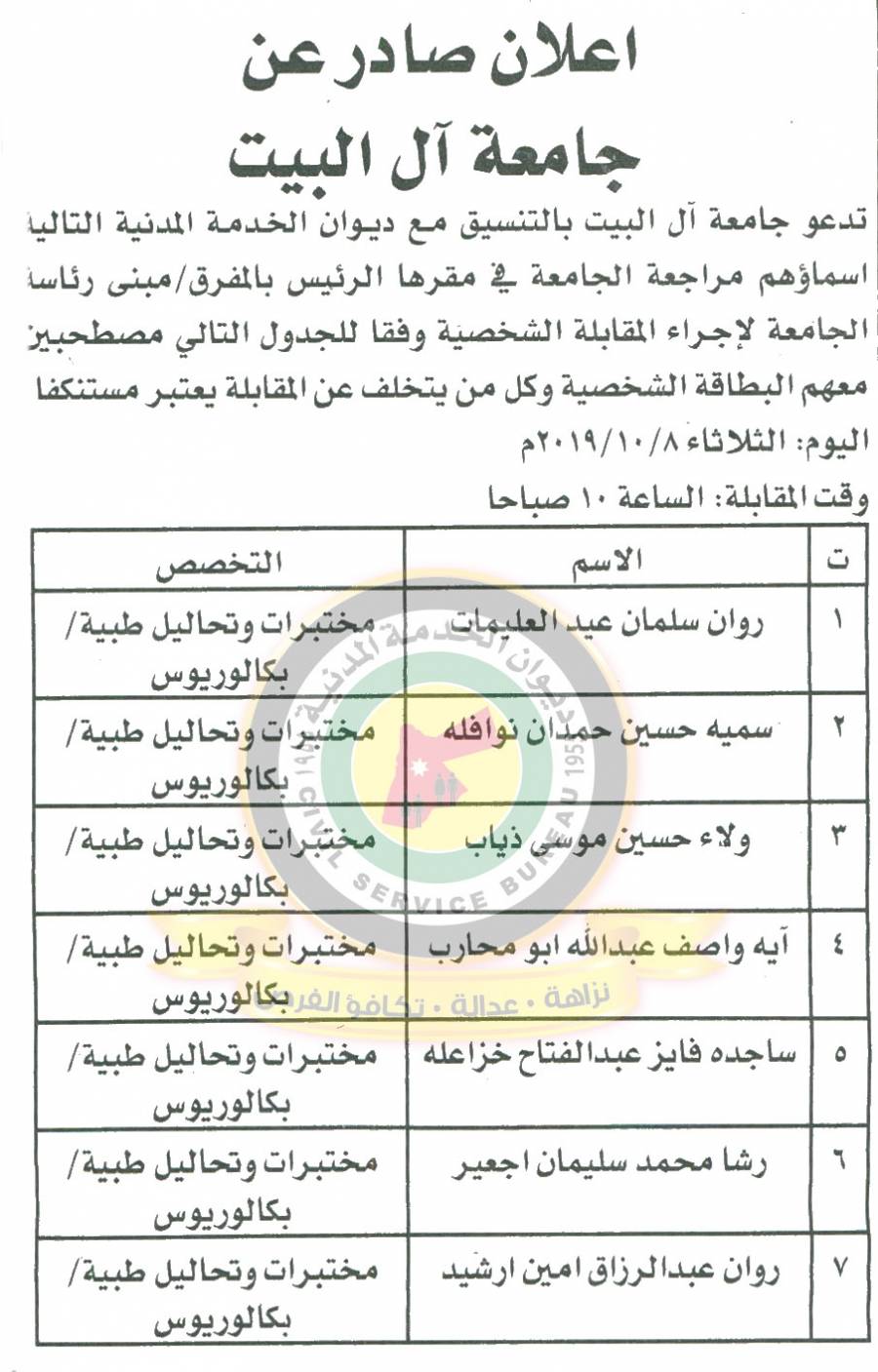 ديوان الخدمة المدنية يعلن اسماء المدعوون لاجراء المقابلات الشخصية وعقد الامتحان التنافسي لغايات التعيين.