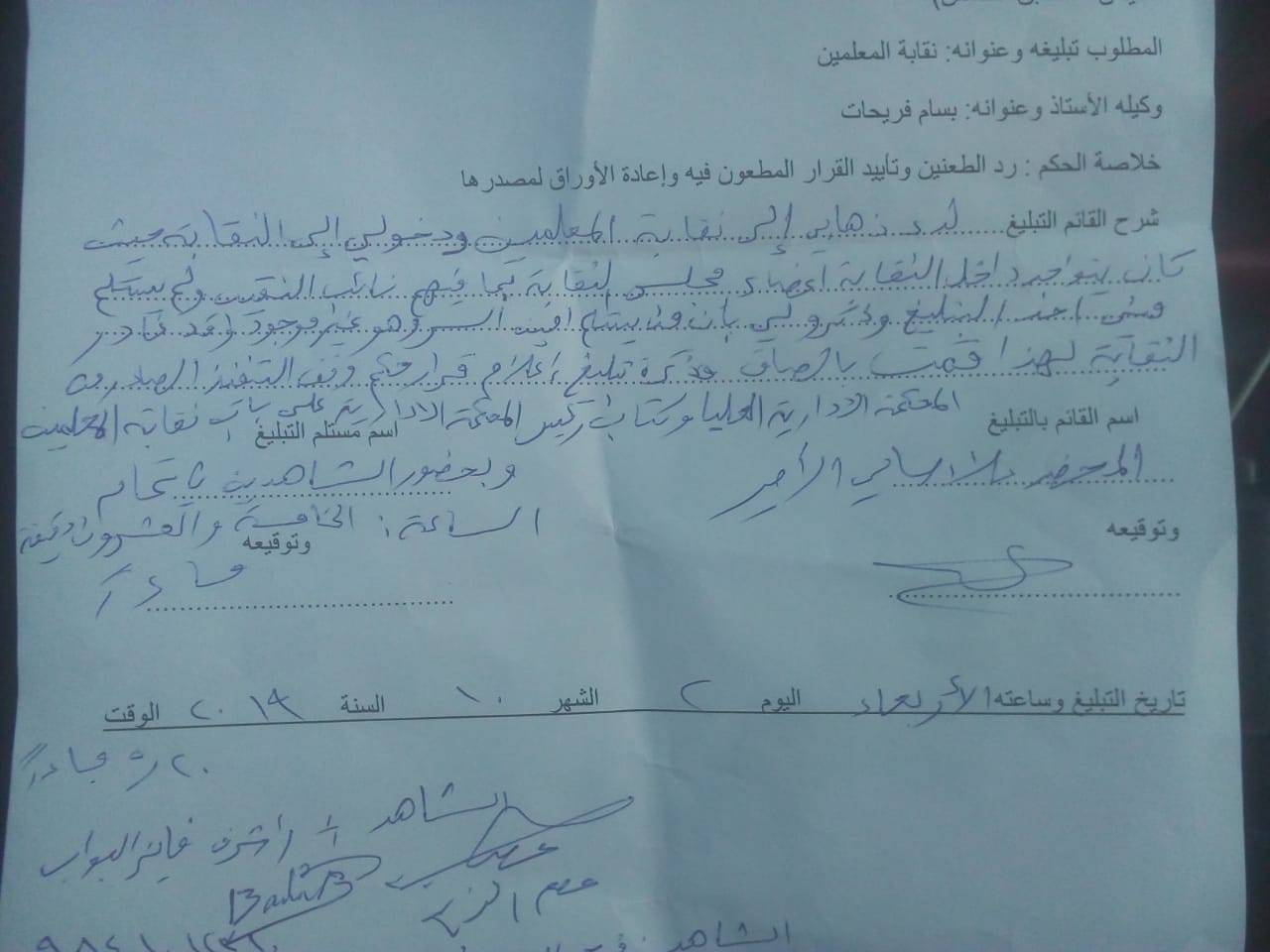 محضر تسلم نقابة المعلمين تبليغا بالقرار القطعي... وثيقة