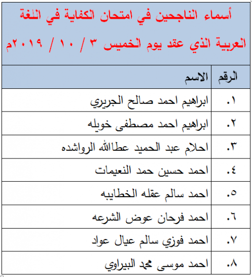 : نيروز الاخبارية: أعلن مجمع اللغة العربية الأردنية قائمة أسماء الناجحين في امتحان الكفاية في اللغة العربية الذي عقد يوم الخميس 3 / 10 / 2019م