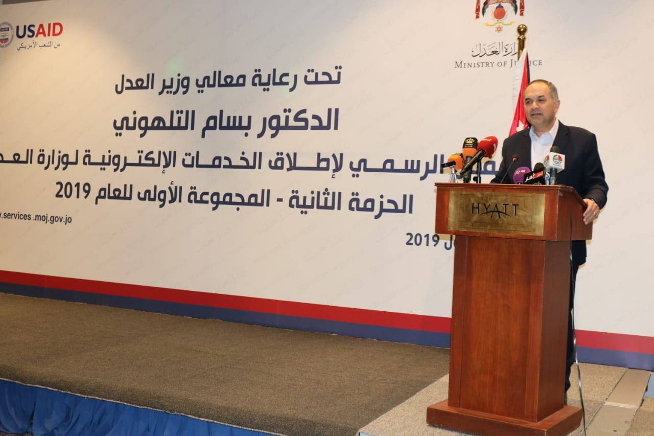 وأعلن وزير العدل الدكتور بسام التلهوني خلال رعايته حفل اطلاق الخدمات ، اطلاق(11) خدمة الكترونية جديدة لعام 2019 يمكن الاستفادة منها من خلال زيارة موقع الخدمات الالكترونية الخاص بوزارة العدل ((https://services.moj.gov.jo والموقع الرسمي للوزراة (http://www.moj.gov.jo )  ، وهذه الخدمات هي: تسجيل المخالفات الواردة من المؤسسات الحكومية ودفعها الكترونياً ، والاستعلام عن التباليغ بالنشر ، و الاستعلام عن المبالغ المحولة الى البنوك في القضايا التنفيذية ، و تسجيل الانذارات العدلية ، و استخراج صورة مصدقة عن وثيقة كاتب العدل ، و تسجيل الطلبات الحقوقية ( الطلبات المستقلة والطلبات المرتبطة بالدعوى) ، و تسجيل الاستئناف ، وخدمة تسجيل اذن تمييز على الدعاوى ودفع رسومها ومتابعتها الكترونياً ، و تقديم اللوائح على الدعاوى ، وخدمة تقديم الاستدعاءات ، وخدمة احجز دورك.