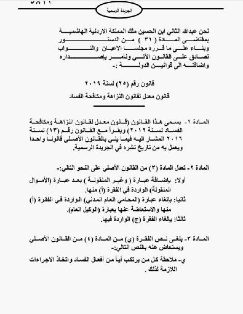 : نيروز الاخبارية: صدر في العدد الاخير من الجريدة الرسمية اليوم الاربعاء الارادة الملكية السامية بالموافقة على القانون المعدل لقانون النزاهة ومكافحة الفساد.