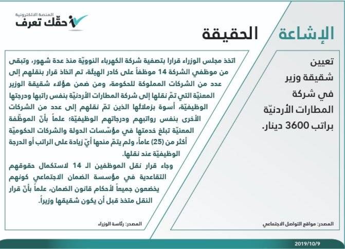واوضحت الحكومة عبر منصة "حقك تعرف" ان مجلس الوزراء اتخذ قراراً بتصفية شركة الكهرباء النوويّة منذ عدة شهور، وتبقى من موظفي الشركة 14 موظفاً على كادر الهيئة، تم اتخاذ قرار بنقلهم إلى عدد من الشركات المملوكة للحكومة، ومن ضمن هؤلاء شقيقة الوزير المعنيّة التي تمّ نقلها إلى شركة المطارات الأردنيّة بنفس راتبها ودرجتها الوظيفيّة، أسوة بزملائها الذين تمّ نقلهم إلى عدد من الشركات الأخرى بنفس رواتبهم ودرجاتهم الوظيفيّة؛ علماً بأنّ الموظّفة المعنيّة تبلغ خدمتها في مؤسّسات الدولة والشركات الحكوميّة أكثر من (25) عاماً، ولم يتمّ منحها أيّ زيادة على الراتب أو الدرجة الوظيفيّة عند نقلها.