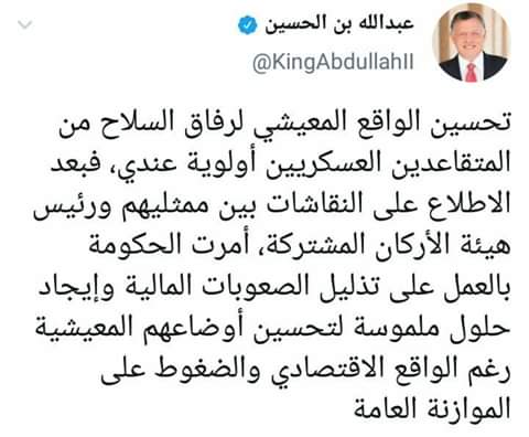 وأضاف جلالته في تغريدة على صفحته الرسمية بتويتر "فبعد الاطلاع على النقاشات بين ممثليهم ورئيس هيئة الأركان المشتركة، أمرت الحكومة بالعمل على تذليل الصعوبات المالية وإيجاد حلول ملموسة لتحسين أوضاعهم المعيشية رغم الواقع الاقتصادي والضغوط على الموازنة العامة".