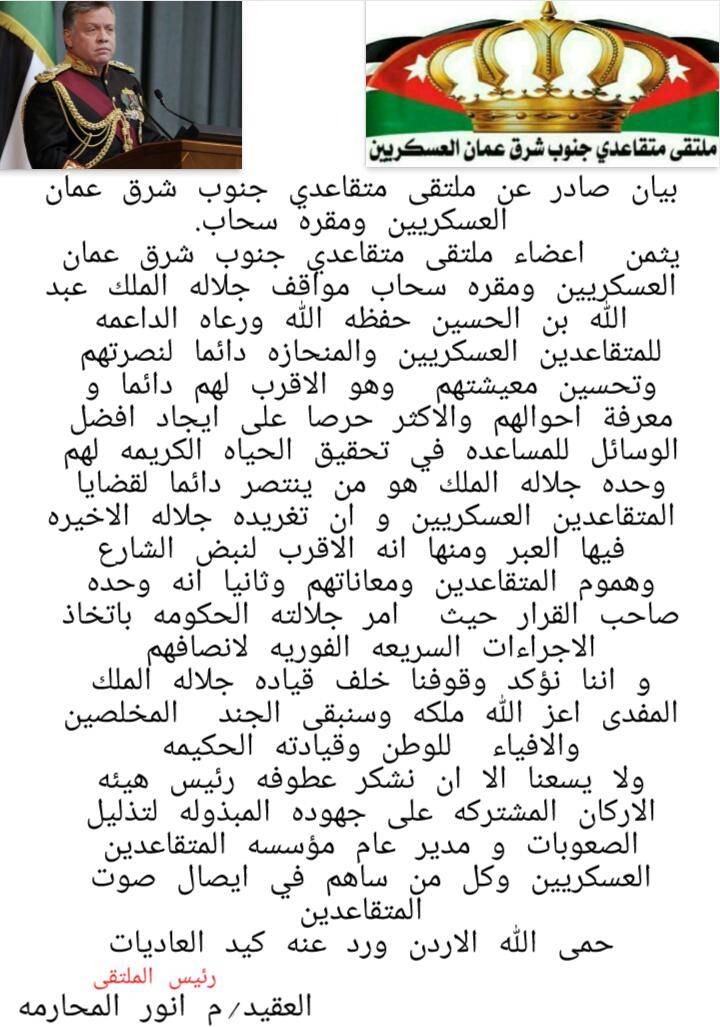 وحده جلاله الملك هو من ينتصر دائما لقضايا المتقاعدين العسكريين و ان تغريده جلاله الاخيره فيها العبر ومنها انه الاقرب لنبض الشارع وهموم المتقاعدين ومعاناتهم وثانيا انه وحده صاحب القرار حيث امر جلالته الحكومه باتخاذ الاجراءات السريعه الفوريه لانصافهم