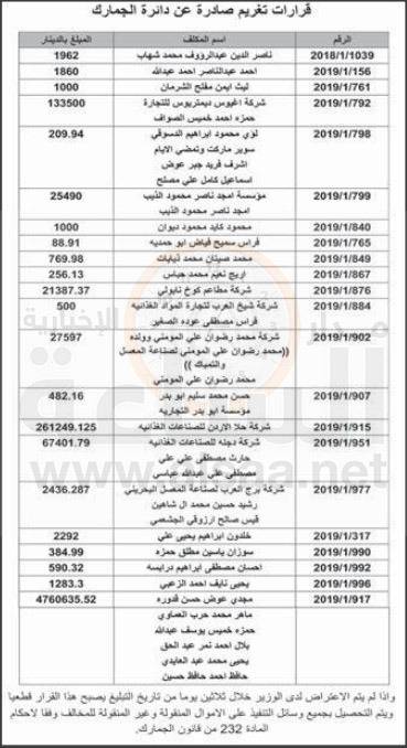 نيروز الاخبارية :- أصدرت دائرة الجمارك العامة، قرارات تغريدم جديدة، محذرة من عدم دفعها، كونه سيتم تحصيلها بجميع الوسائل من الاموال المنقولة وعير المنقولة للشخاص، خلال المدة المحددة ادناه.