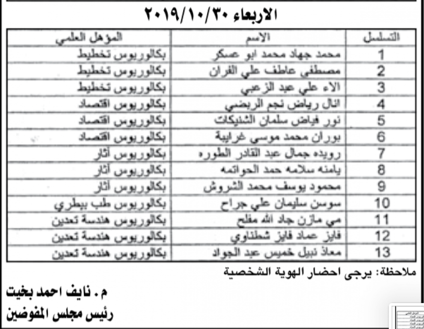 نيروز الاخبارية :دعت سلطة منطقة العقبة الاقتصادية الخاص وبالتعاون مع ديوان الخدمة المدنية المذكورين تاليا للمقابلة الشخصية والاشتراك في الامتحان التنافسي لغايات تعيين من تنطبق عليه الشروط منهم في ملاك السلطة، وذلك وفق المواعيد المحددة كما يلي: