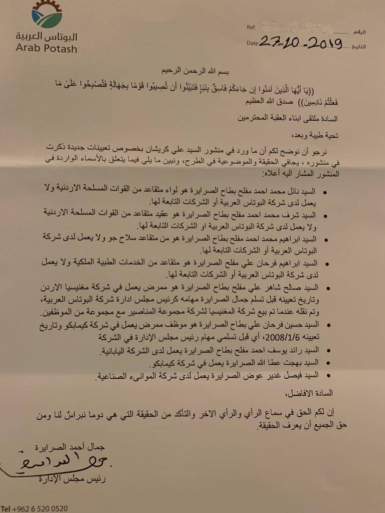 ونوهت البوتاس انها وإذ تحترم النقد البناء وتعظم من دوره في تطوير الأداء المؤسسي الا لن ترد على مثل تلك الاشاعات و الأكاذيب الا من خلال القضاء و بالوثائق . وأنها لن تتهاون في حماية سمعة الشركة محليا و دوليا ، وستبذل جهدها في ملاحقة المسيئين من خلال فريق قانوني متخصص.