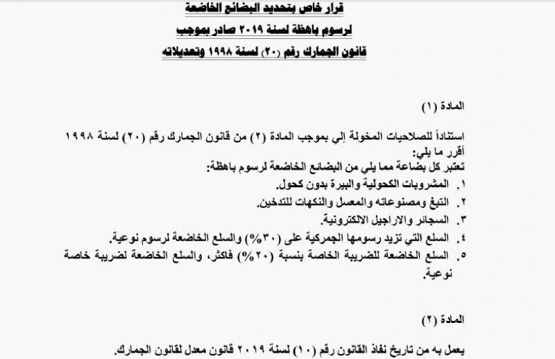 نيروز الاخبارية: صدر في العدد الجديد بالجريدة الرسمية ظهر اليوم الخميس، قرار خاص بتحديد البضائع الخاضعة لرسوم باهظة، لعام 2019، واستناداً لقانون الجمارك رقم (20) لسنة 1998.