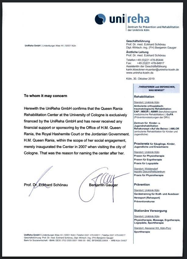 تود مؤسسة UniReha GmbH التأكيد على أن مركز الملكة رانيا للتأهيل في جامعة كولونيا يتم تمويله حصرياً من قبل مؤسسة  UniReha GmbH، ولم يحصل أبداً على أي رعاية أو دعم مالي من مكتب جلالة الملكة رانيا، أو الديوان الملكي الهاشمي أو الحكومة الأردنية.