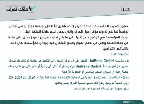 أصدرت المؤسسة المالكة لمركز إعادة تأهيل الأطفال بجامعة كولونيا في ألمانيا توضيحاً لما يتم تداوله مؤخراً حول المركز والذي يحمل اسم جلالة الملكة رانيا.