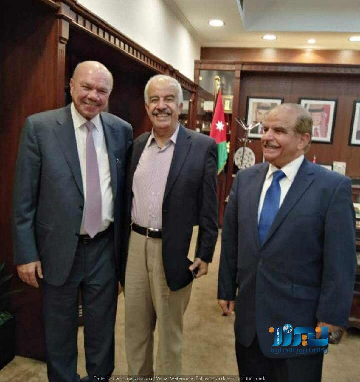 نيروز الإخبارية: قام وفد من اللجنة الوطنية للعسكريين السابقين بزيارة الى دولة فيصل عاكف الفايز / رئيس مجلس الاعيان برفقة العين غازي الطيب وذلك لدعوته بالتفضل ليكون المتحدث الرئيس بالندوة التي ستقيمها اللجنة بعنوان ( منجزات العهدين. جلالة الحسين وجلالة ابا الحسين ) وذلك الساعة ١١ صباح السبت الموافق ٢٣ تشرين ثاني في قاعة غرفة صناعة عمان .