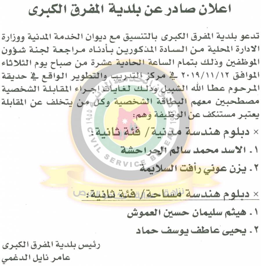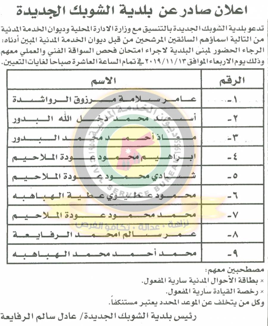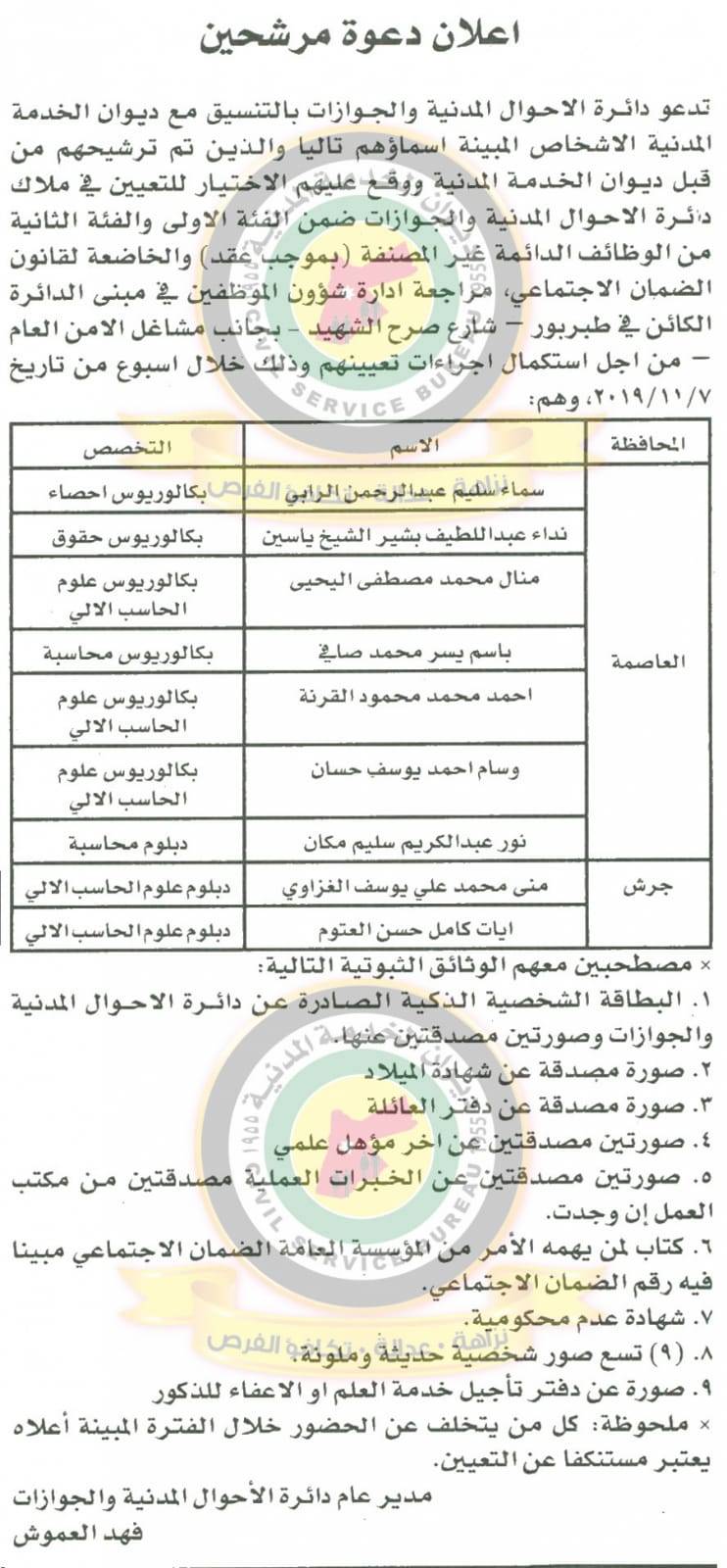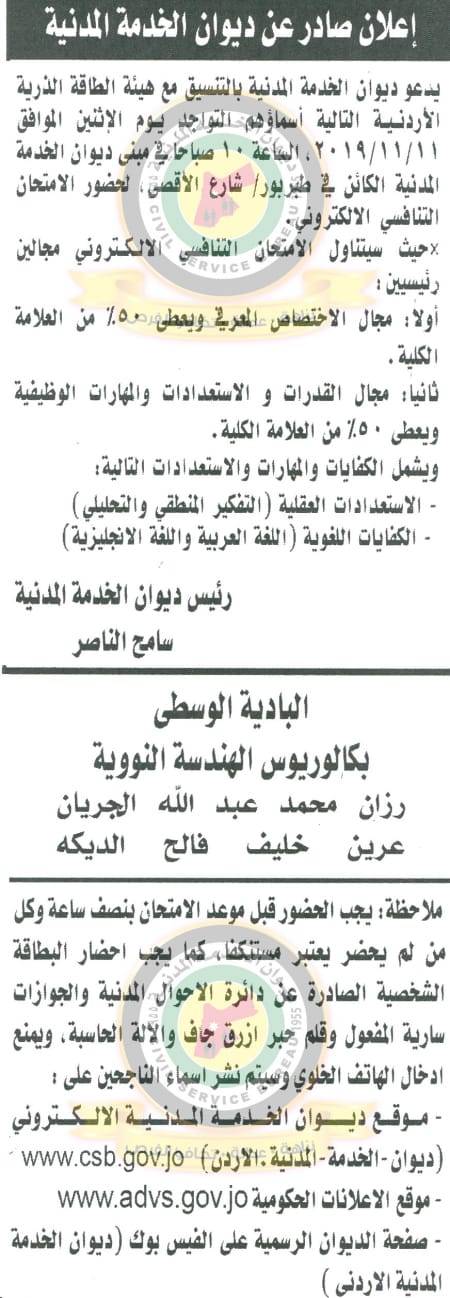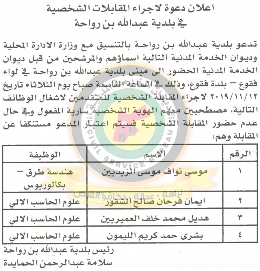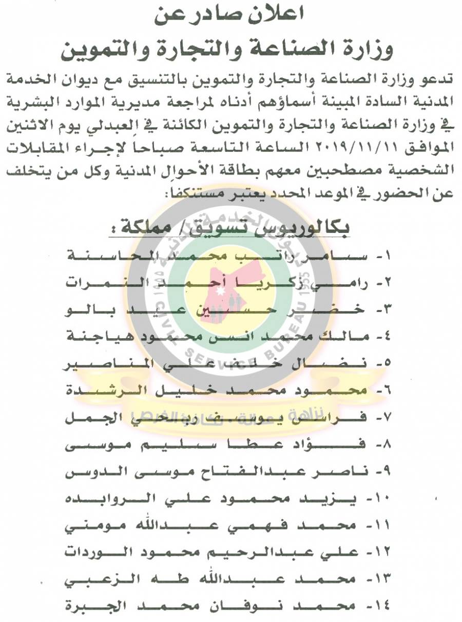 نيروز الإخبارية : نيروز الاخبارية: دعا ديوان الخدمة المدنية بالتعاون مع مختلف الوزارات والمؤسسات الحكومية، التالية اسماؤهم لاجراء المقابلات الشخصية وعقد الامتحان التنافسي لغايات التعيين.