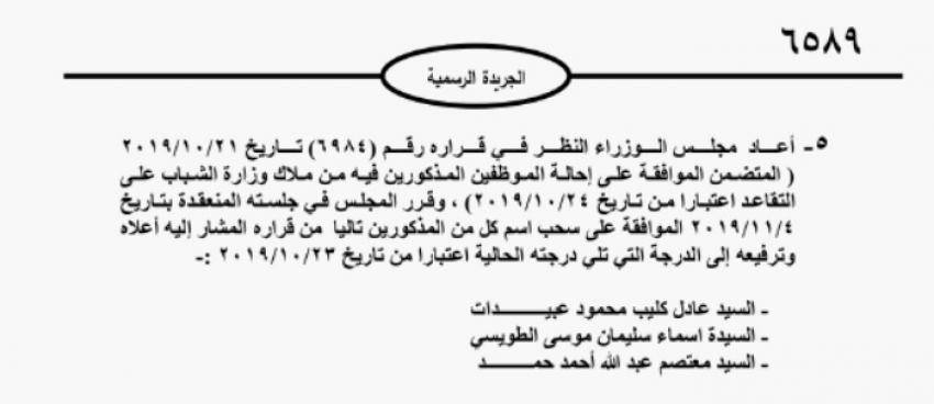 وجاء القرار الصادر في عدد الجريدة الرسمية اليوم الاحد، بسحب اسماء ثلاثة موظفين في الوزارة من قرار الاحالة الى التقاعد، بعد 10 أيام من تاريخ سريان الاحالة الى التقاعد.