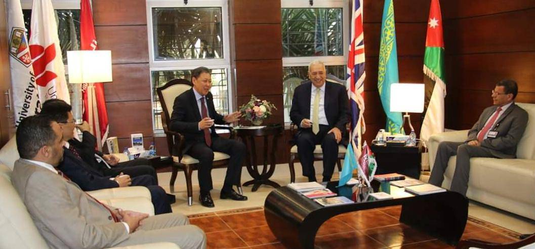 وأجرى رئيس مجلس أمناء الجامعة الدكتور يعقوب ناصر الدين ورئيسها الأستاذ الدكتور محمد الحيلة، محادثات مع السفير الكازاخستاني سبقت المحاضرة، تناولت امكانيات تعزيزوتوثيق التعاون الأكاديمي بين جامعة الشرق الأوسط ونظيراتها الكازاخستانية، فيما أكد الدكتور ناصر الدين أن هذه العلاقات هي الكفيلة لتعريف المجتمع الأردني بعراقة وأصالة الشعب الكازاخي.