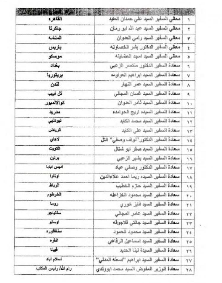 نيروز الاخبارية : كشفت وزارة الخارجية وشؤون المغتربين عن وجود 27 سفيراً أردنيّاً في الخارج ووزيراً مفوضاً في رام الله.