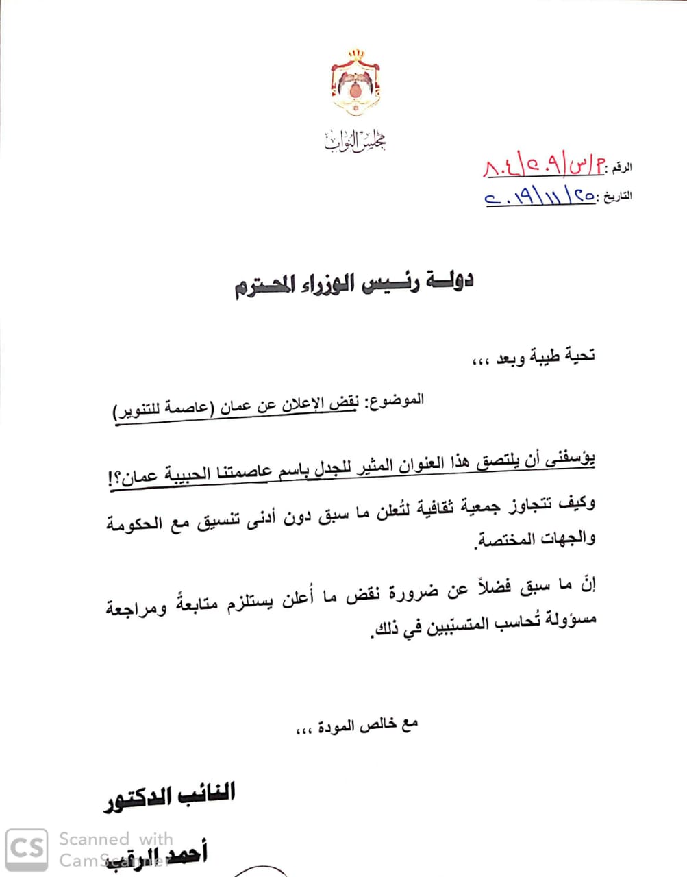 قام اليوم بمخاطبة رئيس الوزراء مُظهراً أسفه بإلتصاق إسم مدينة عمان الحبيبة بهذا العنوان المثير للجدل دون تنسيق مسبق من الجهة القائمة عليه مع الحكومة والجهات المختصة كما جاء في كتابه المرفق مع الخبر.