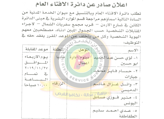نيروز الاخبارية: يدعو ديوان الخدمة المدنية التالية أسماؤهم لاجراء المقابلات الشخصية وعقد الامتحان التنافسي لغايات التعيين.