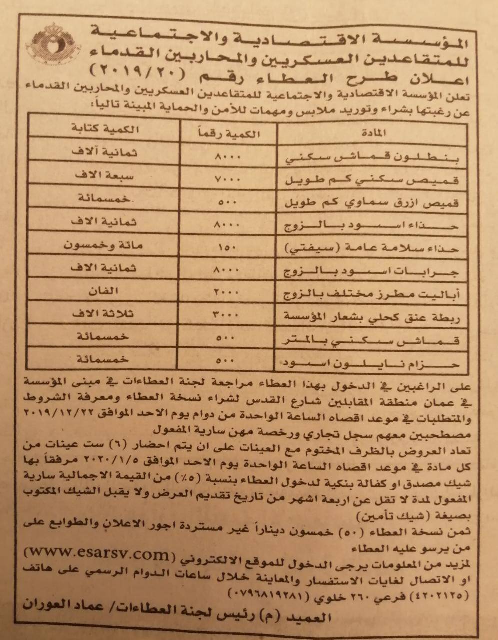 اعلان طرح عطاء شراء ملابس ومهمات لمؤسسة المتقاعدين العسكريين