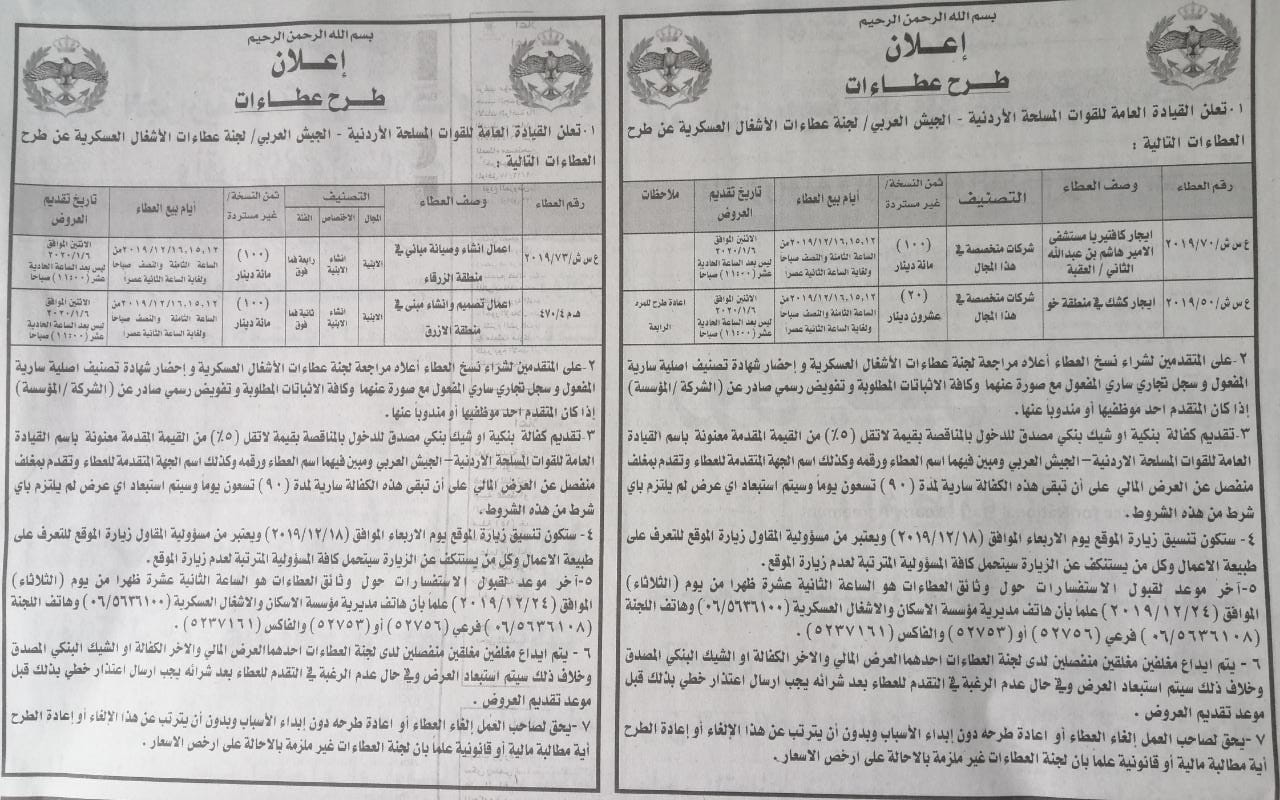 : نيروز الاخبارية :- القيادة العامة للقوات المسلحة الأردنية الجيش العربي عن طرح العطاءات التالية :