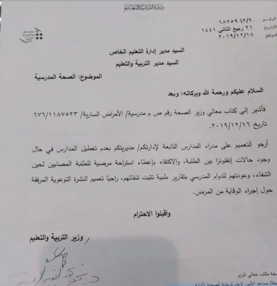 عاجل : التربية: اي طالب يصاب بالانفلونزا لن يسمح له بالعودة للمدرسة إلا بتقرير طبي .. وثيقة