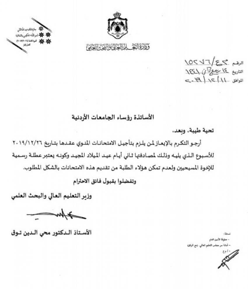 على رؤساء الجامعات الأردنية، بالايعاز لتأجيل الامتحانات المنوي عقدها