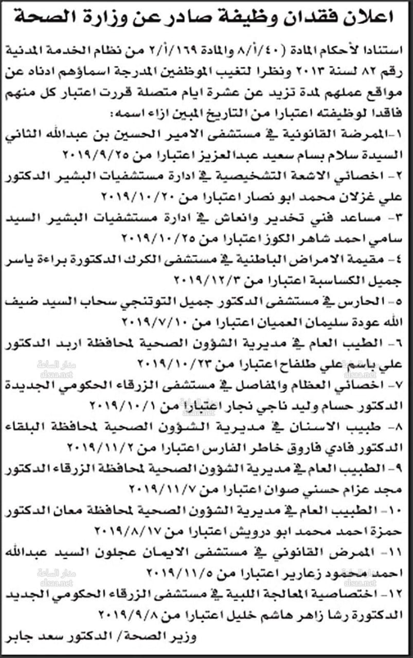 : نيروز الاخبارية: أعلنت وزارة الصحة أن الموظفين المدرجة اسماؤهم أدناه فقدوا وظائفهم نظرا لتغيبهم عن مواقع عملهم لمدة تزيد على عشرة ايام متصلة.