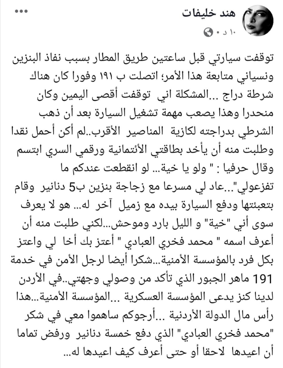 عاد لي مسرعا مع زجاجة بنزين ب5 دنانير وقام بتعبئتها ودفع السيارة بيده مع زميل آخر له... هو لا يعرف سوى أني "خية" و الليل بارد وموحش...لكني طلبت منه أن أعرف اسمه " محمد فخري العبادي " أعتز بك أخا لي واعتز بكل فرد بالمؤسسة الأمنية...شكرا أيضا لرجل الأمن في خدمة 191 ماهر الجبور الذي تأكد من وصولي وجهتي..في الأردن لدينا كنز يدعى المؤسسة العسكرية..المؤسسة الأمنية...هذا رأس مال الدولة الأردنية ...أرجوكم ساهموا معي في شكر "محمد فخري العبادي" الذي دفع خمسة دنانير ورفض تماما أن اعيدها لاحقا أو حتى أعرف كيف اعيدها له...