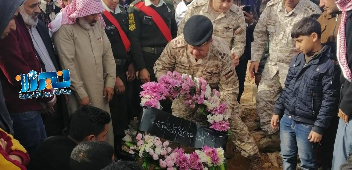 صورة معبرة للعميد علي الدومي وهو يحتضن ابن المرحوم العميد الجبور اثناء مراسم الدفن