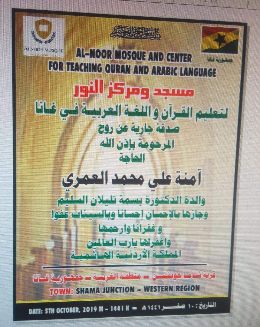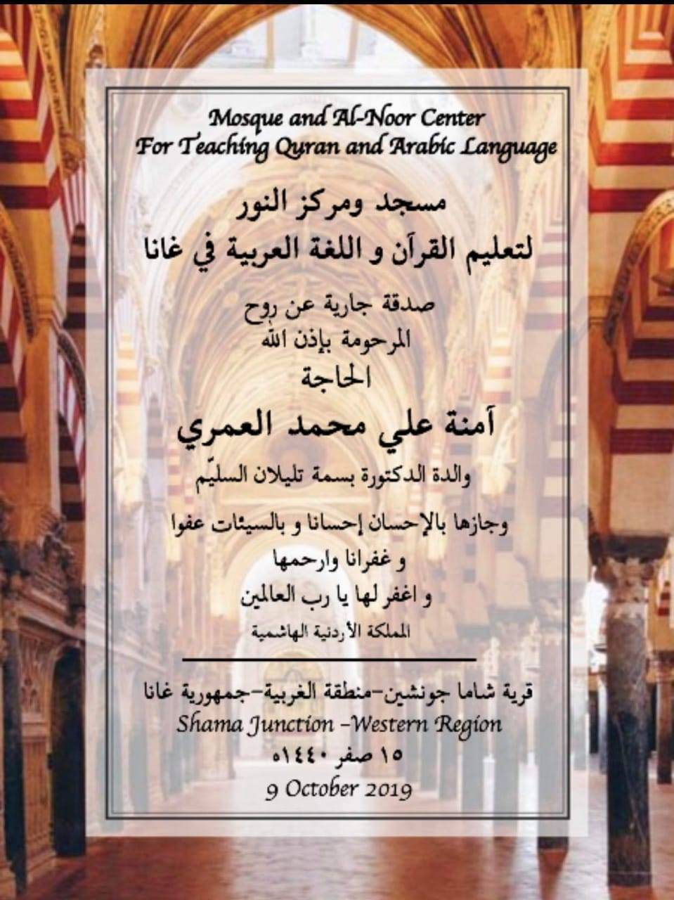 نيروز الاخبارية :- عندما أرادت الدكتورة بسمه السليم أن تقدم عملاً خيرياً عن روح والدتها، فقد قررت التبرع ببناء مسجد يخصص من مساحته كمركز لتعليم القرآن الكريم واللغة العربية في قريةً افريقية لايوجد بها اي مسجد او مكان للتعليم هناك ،فكان لقرية جوتشين الافريقية بجمهورية غانا الافريقية المكان المناسب ، التي دخل الاسلام اليها حديثاً ،حيث ان القرية تعاني من عدم وجود مساجد او مراكز تعليمية للغة العربية ومدارس لحفظ القران الكريم .