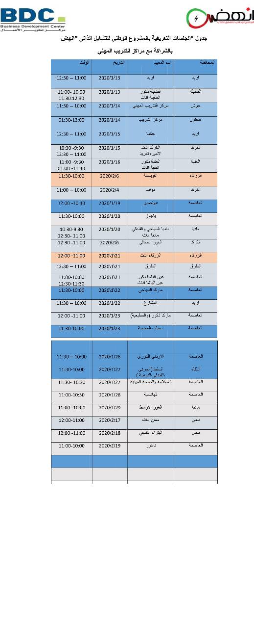 انسجاماً مع رؤية جلالة الملك عبدالله الثاني في محاربة البطالة، من خلال دعم ثقافة التشغيل الذاتي وإنشاء المشاريع الإنتاجية في مختلف القطاعات التشغيلية وضمن رؤية ورسالة مؤسسة التدريب المهني التي استجابت للتوجيهات الملكية السامية ومن خلال شبكة علاقاتها مع جميع الجهات المعنية بالتدريب والتشغيل في قطاع التدريب المهني والتقني قامت المؤسسة وبالتنسيق مع مركز تطوير الأعمال من أجل عقد جلسات تعريفية تستهدف متدربي ومتدربات معاهد التدريب المهني في مختلف محافظات المملكة لتوعيتهم بأهداف برنامج  "إنهض" لتطوير برنامج تمويلي متكامل لدعم المشاريع الصغيرة والمتوسطة للشباب، يضمن تأهيل المتقدمين عبر برامج التدريب التي تمكنهم من التقدم للحصول على القروض الميسرة، فضلا عن متابعة المشاريع تحقيقا لمبدأ الاستدامة. علماً بأنه قد تم تنفيذ عدد منها في اربد، الطفيلة، جرش، عجلون، الكرك