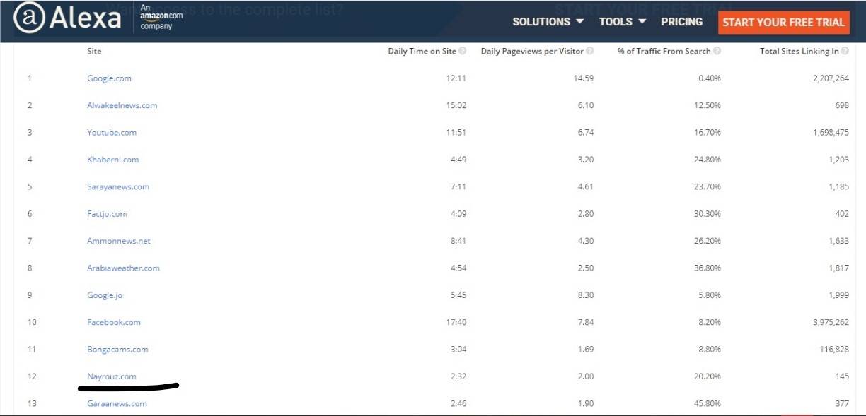 نيروز الاخبارية : أصدر موقع ألكيسا (ALEXA) العالمي الشهير المتخصص في إحصائيات وترتيب المواقع وقد جاءت "نيروز الاخبارية " في الترتيب " 6 " بين المواقع الإخبارية في الأردن من بين ( ١٢٤ ) موقعاً عاملا والثاني عشر على مستوى المواقع الإلكترونية وفق موقع الكيسا.