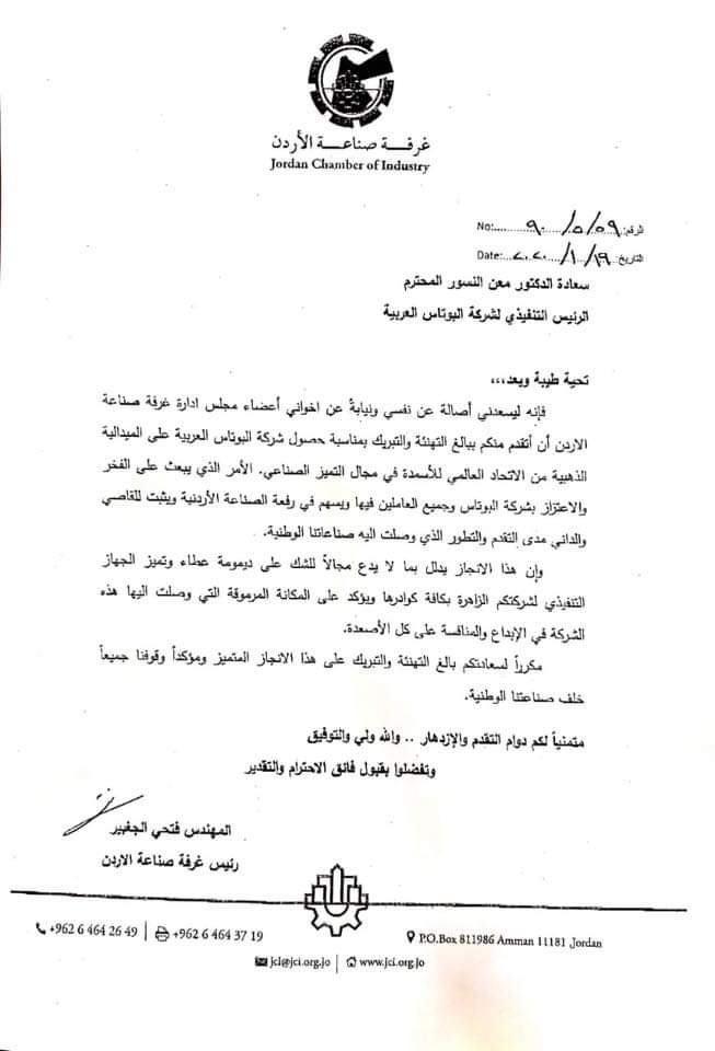 عبر رئيس غرفة صناعة الأردن وعمان المهندس فتحي الجغبير عن تقدير مجلس إدارة غرفة صناعة الأردن لانجاز شركة البوتاس العربية في مجال التميز الصناعي والذي أهلها للحصول على الميدالية الذهبية في هذا المجال من الاتحاد العالمي للأسمدة. ويذكر أن الميدالية تمنح للشركة التي تعمل في مجال صناعة الأسمدة وتحقق نتائج متقدمة في مجال الإنتاجية وسلامة العاملين والمحافظة على البيئة.