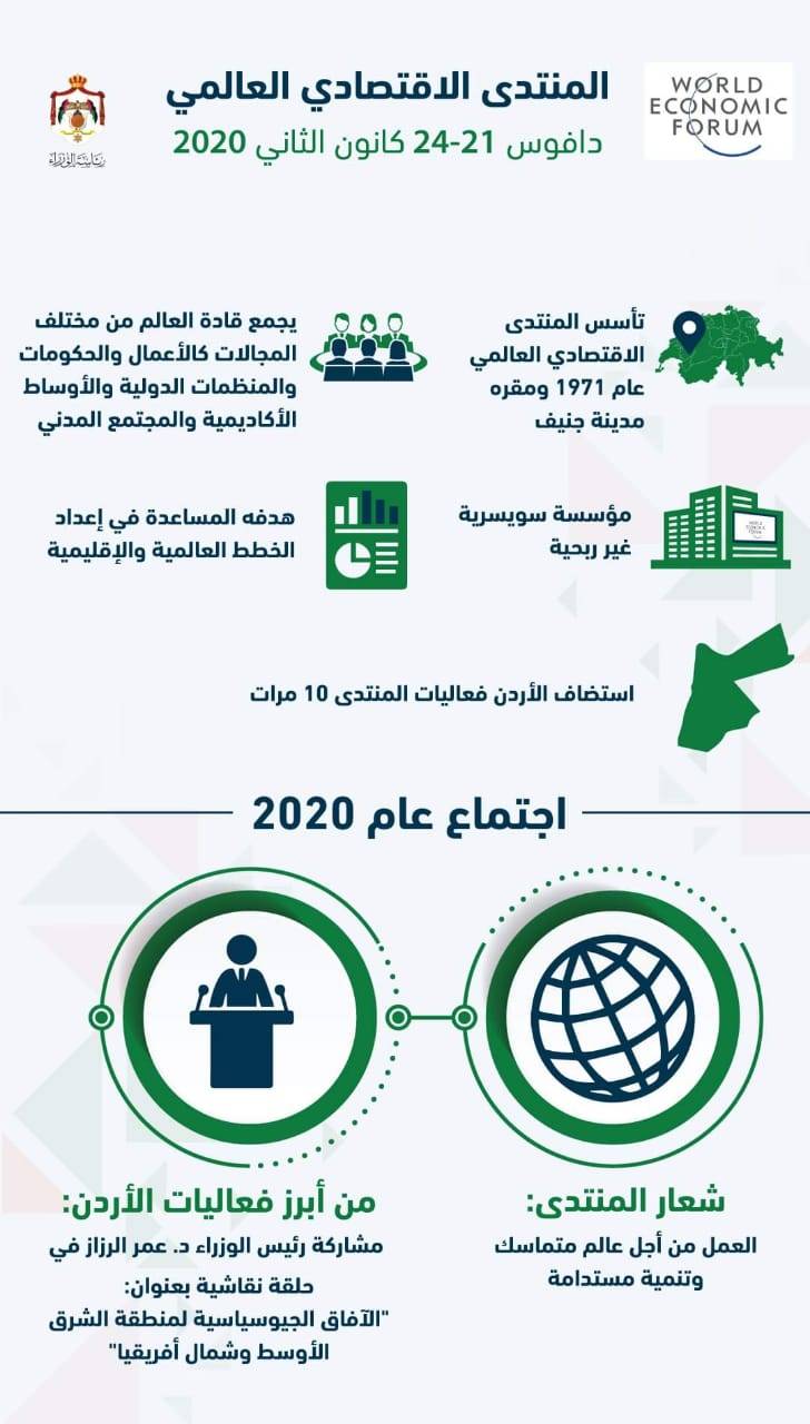 يشار الى ان المنتدى الاقتصادي العالمي الذي تاسس عام 1971 ومقره جنيف هو مؤسسة غير ربحية يهدف الى المساعدة في اعداد الخطط العالمية والاقليمية ويعقد اجتماعاته السنوية في دافوس بسويسرا وفي العديد من الدول ومن بينها الاردن الذي استضاف فعاليات المنتدى 10 مرات.