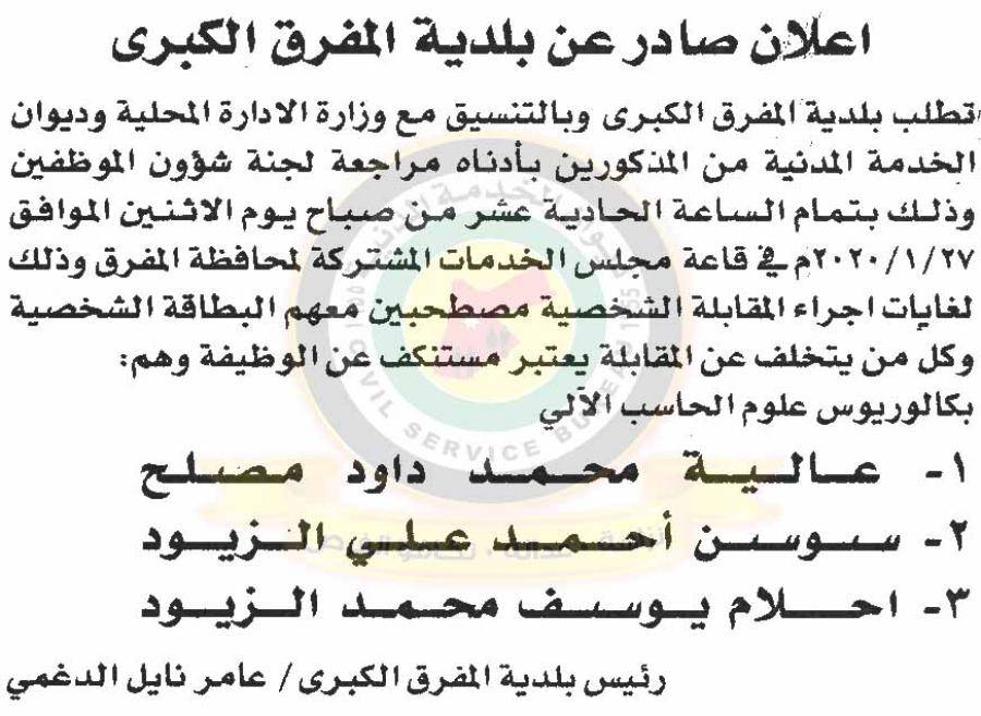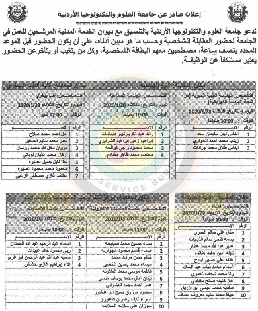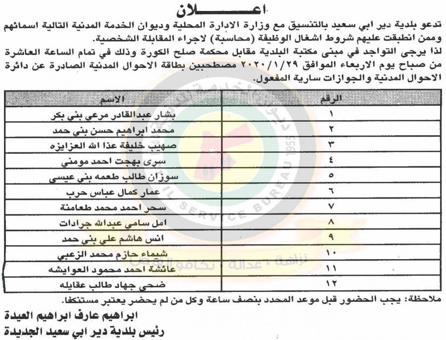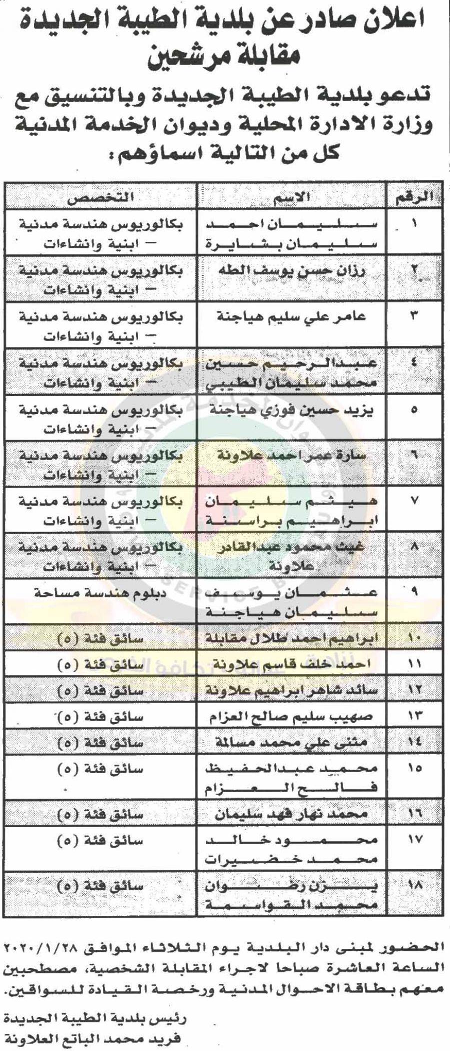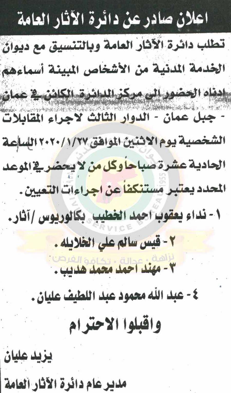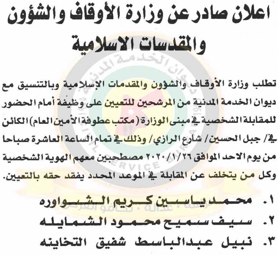 نيروز الإخبارية : نيروز الاخبارية: دعا ديوان الخدمة المدنية بالتعاون مع مختلف الوزارات والمؤسسات الحكومية، التالية اسماؤهم لاجراء المقابلات الشخصية وعقد الامتحان التنافسي لغايات التعيين.