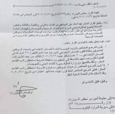 وجاء في القرار انه يقوم المرجع المختص بتزويد المؤسسة العامة للضمان الاجتماعي باسماء الموظفين المشمولين بمظلة الضمان الاجتماعي الذين بلغت اشتراكاتهم 360 اشتراكا في الضمان -30 عاما فاكثر ولغاية 28/2 /2020 للتأكد من عدد الاشتراكات الفعلية لكل واحد منهم بالاضافة الى التحقق من استيفائه شروط استحقاق الراتب للتقاعد المبكر وذلك بالتنسيق مع وزارة المالية / مديرية التقاعد المدني والتعويضات.