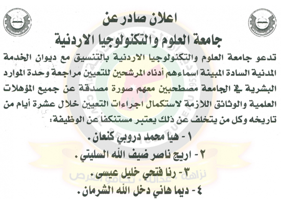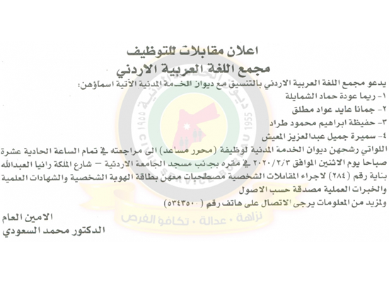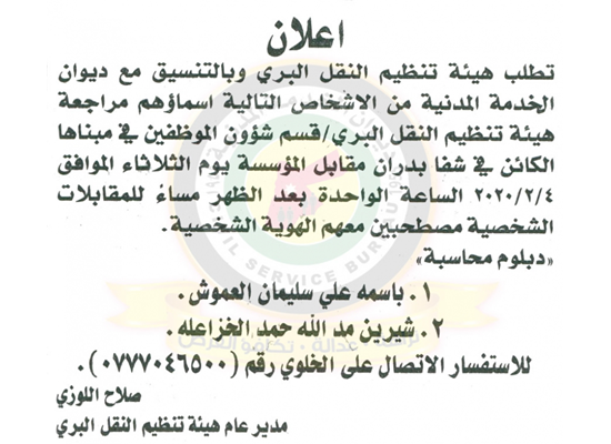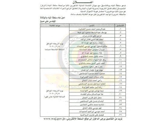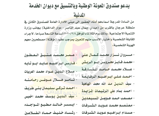 يدعو ديوان الخدمة المدنية بالتعاون مع مختلف الوزارات والمؤسسات الحكومية، التالية اسماؤهم لاجراء المقابلات الشخصية وعقد الامتحان التنافسي لغايات التعيين.