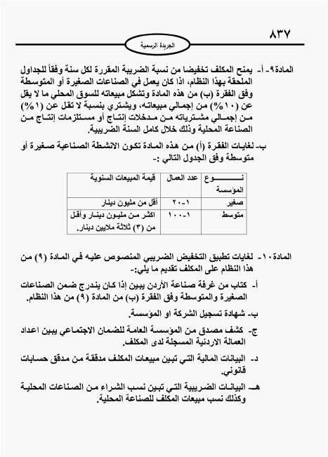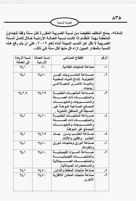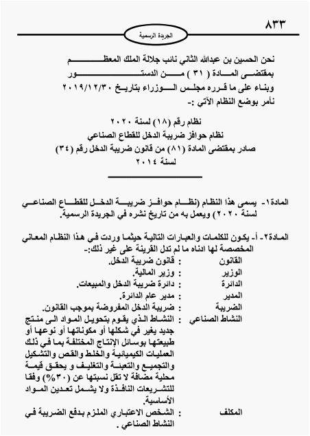 منح نظام صادر بالجريدة الرسمية يوم الأحد، المكلفين من الأشخاص الاعتباريين  المُلزمين بدفع  ضريبة النشاط الصناعي حوافز ضريبية مرتبطة بنسب تشغيل الأردنيين، بالإضافة إلى تشغيل المرأة الأردنيةأو ذوي الإعاقة.