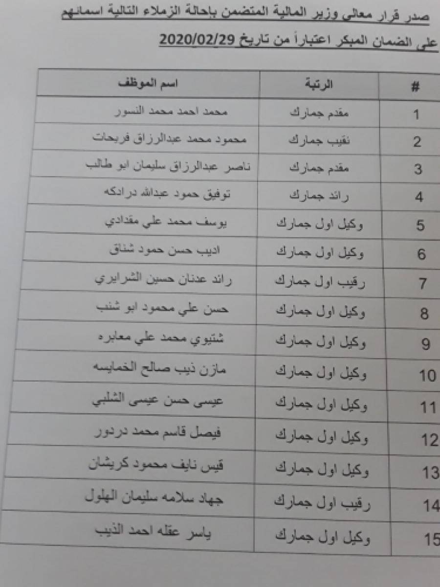 كما قرر وزير المالية احالة عدد من مرتبات الجمارك على الضمان المبكر اعتبارا من ذات التاريخ 29-02-2020.