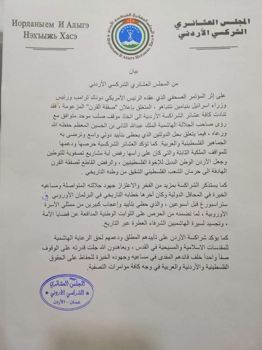 3/2/2020 صفقة القرن مع الملك... وصل موقع نيروز الاخبارية بيان صادر عن المجلس العشائري الشركسي.