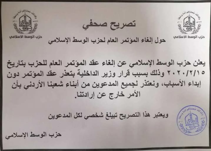 وكان من المقرر عقد المؤتمر السبت في مدينة الحسين للشباب، وتم توزيع رقاع الدعوات منذ أكثر من أسبوع، تحت عنوان الاصلاح السياسي واقع وتطلعات.