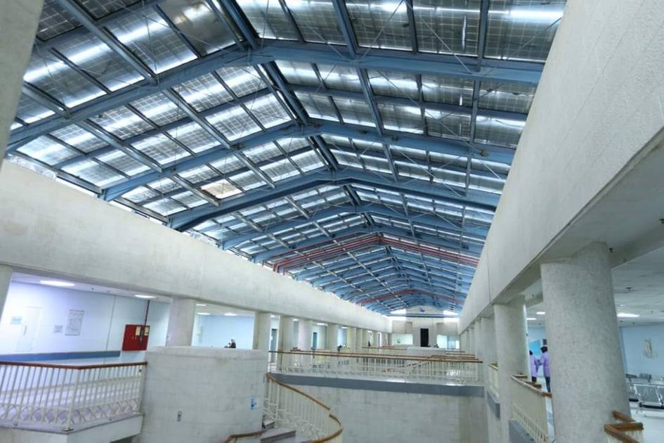 2- تغطية السقف الزجاجي لمبنى العيادات وانجاز المرحله الاولى لمشروع الطاقة الشمسيه