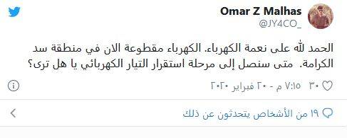وقبل ساعات، عاد ملحس وأعلن انقطاع الكهرباء عن منطقة سد الكرامة، متسائلا: متى سنصل إلى مرحلة استقرار التيار الكهربائي يا هل ترى؟