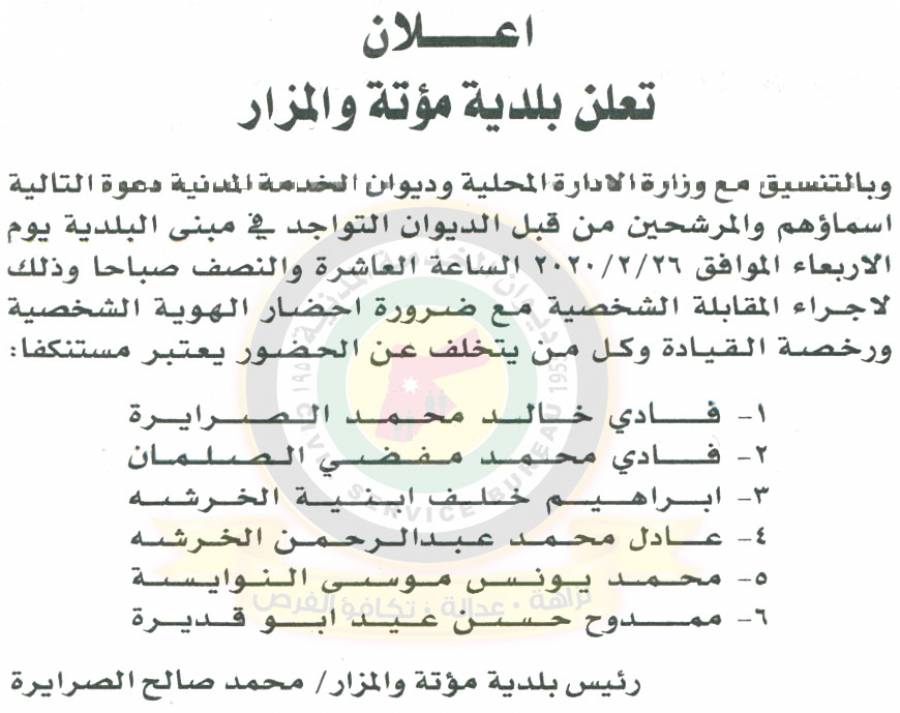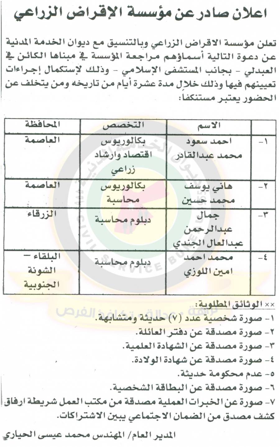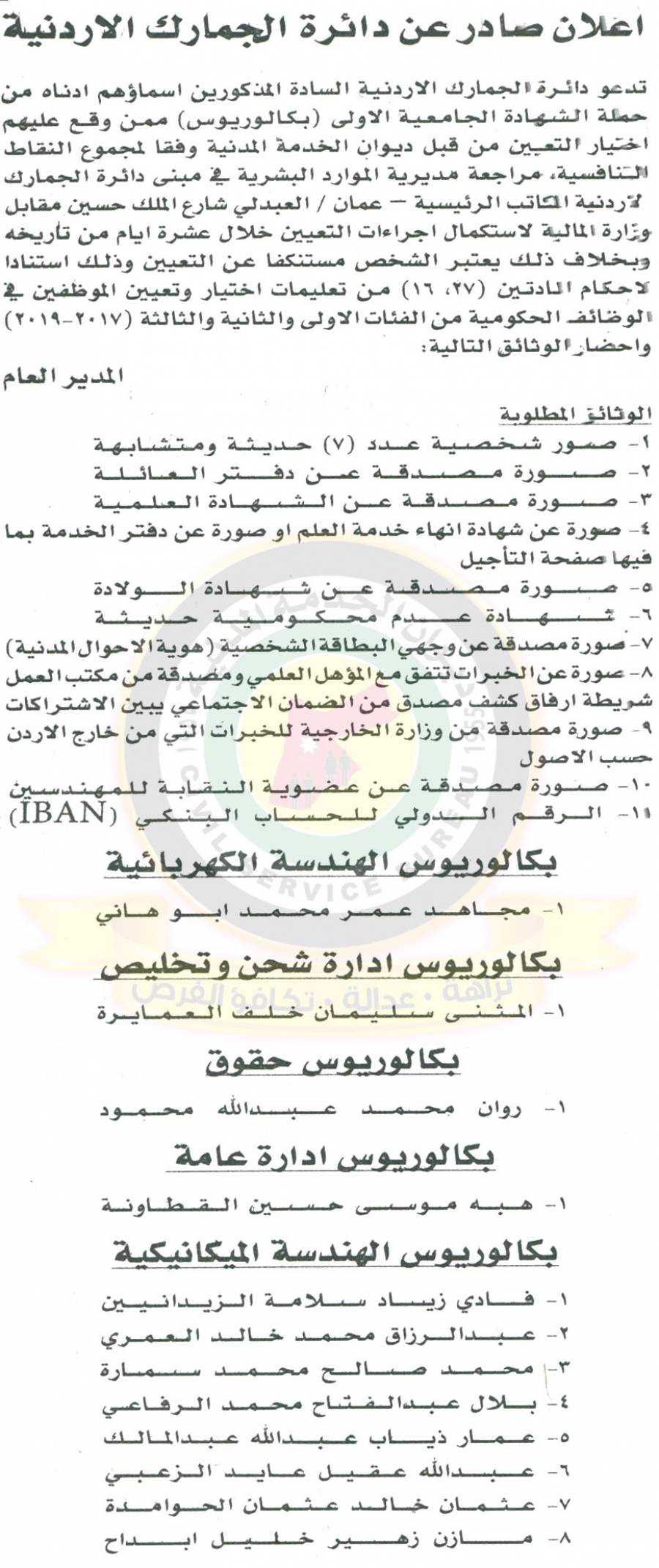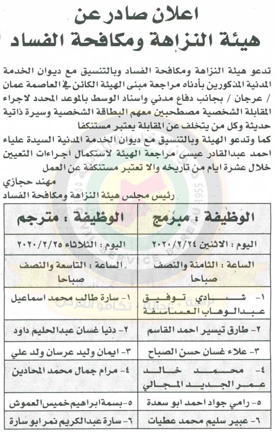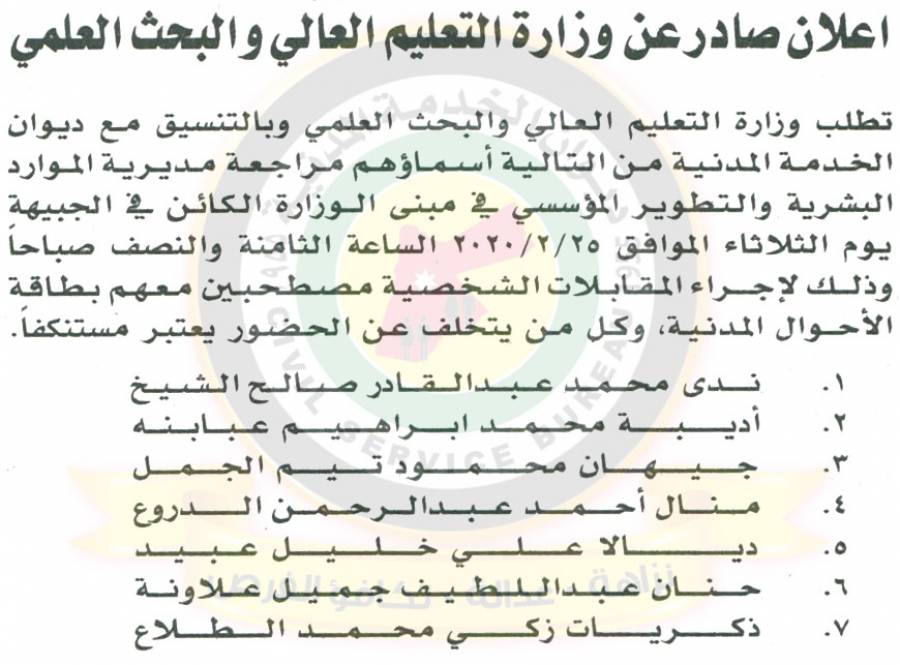 دعا ديوان الخدمة المدنية بالتعاون مع مختلف الوزارات والمؤسسات الحكومية، التالية اسماؤهم لاجراء المقابلات الشخصية وعقد الامتحان التنافسي لغايات التعيين.