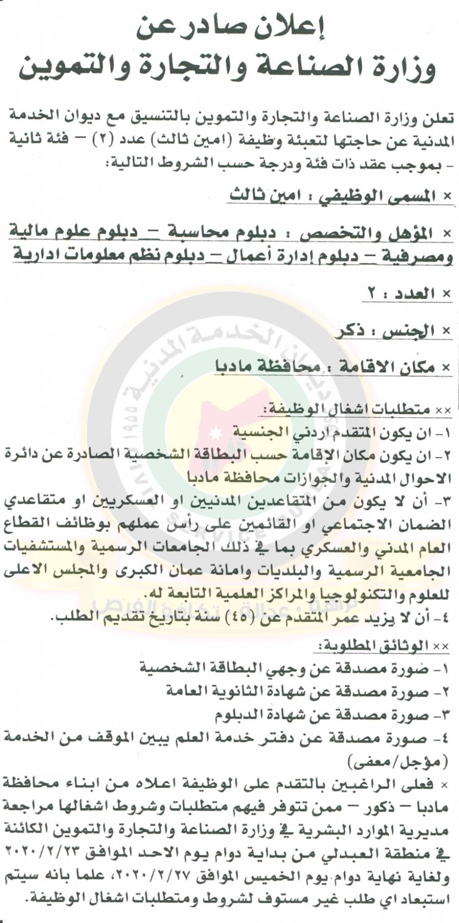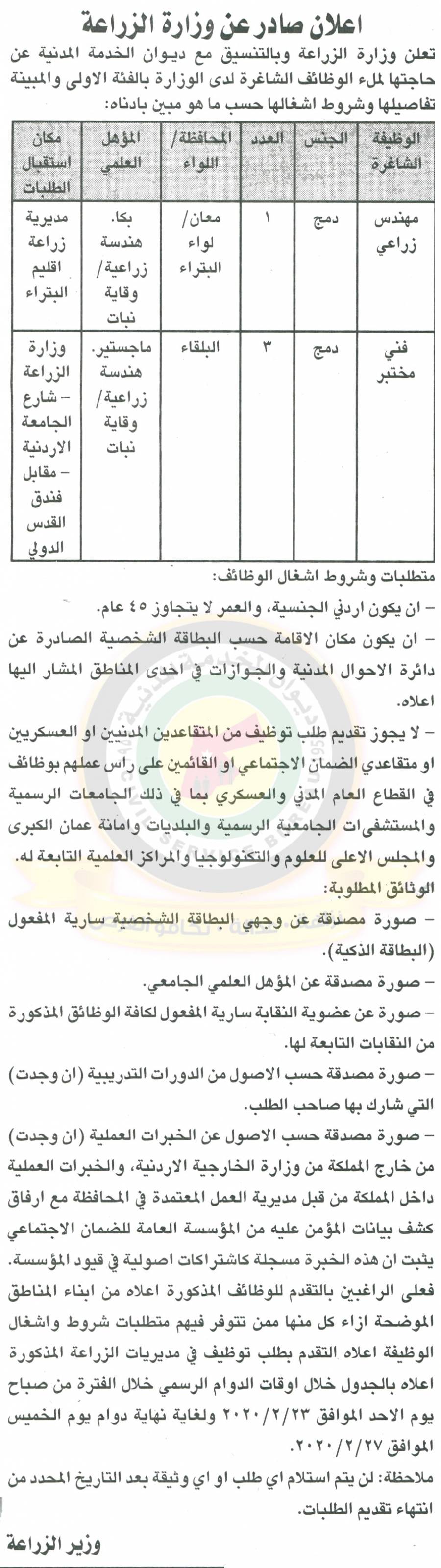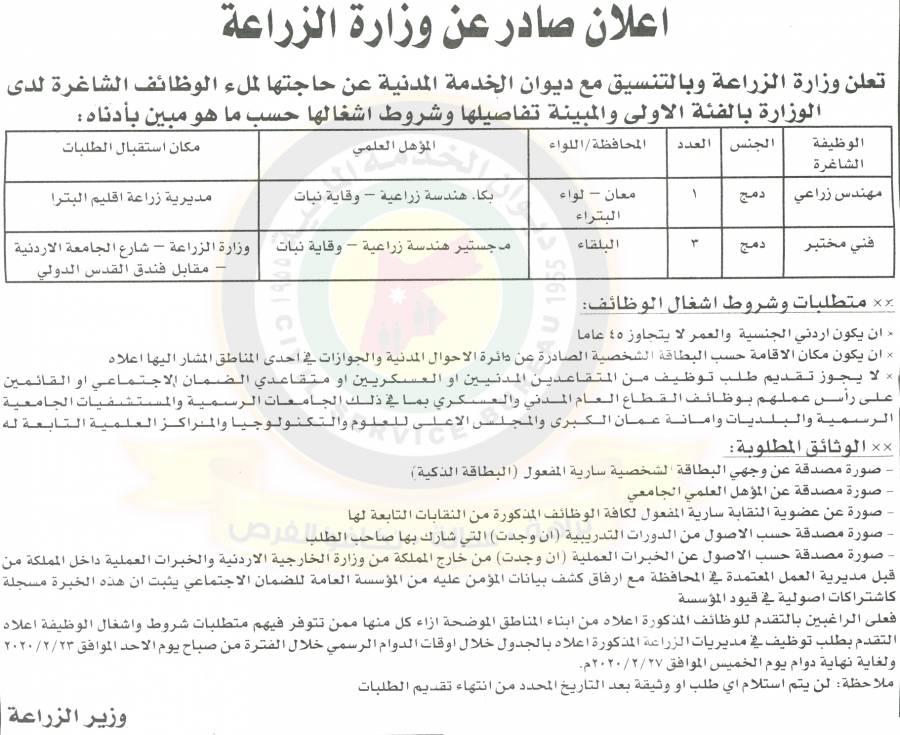 وتعلن رئاسة الوزراء عن توفر شاغر مفوض / شؤون المصادر الطبيعية في هيئة تنظيم قطاع الطاقة والمعادن ، فعلى من تتوافر فيه متطلبات إشغال هذه الوظيفة التقدم بطلب من خلال الرابط الالكتروني على موقع ديوان الخدمة المدنية (Empreq.csb2.gov.jo) على ان يرفق مع الطلب السيرة الذاتية وصور عن المؤهلات العلمية والشهادات المهنية وشهادات الخبرة والوثائق المعززة للكفايات القيادية والادارية المطلوبة للوظيفة، وسيتم استبعاد أي طلب غير مستوفي للأوراق الثبوتية المطلوبة، ويحصل كل من تقدم بطلب على إشعار الكتروني يفيد باستلام طلبه، علماً بأنه سيتم الإعلان عن الوظيفة على الموقع الإلكتروني لرئاسة الوزراء (www.pm.gov.jo) والموقع الإلكتروني لهيئة تنظيم قطاع الطاقة والمعادن (www.emrc.gov.jo) الموقع الالكتروني لديوان الخدمة المدنية (www.csb.gov.jo) والمواقع الالكترونية للسفارات الاردنية ولمدة خمسة ايام عمل من تاريخه.