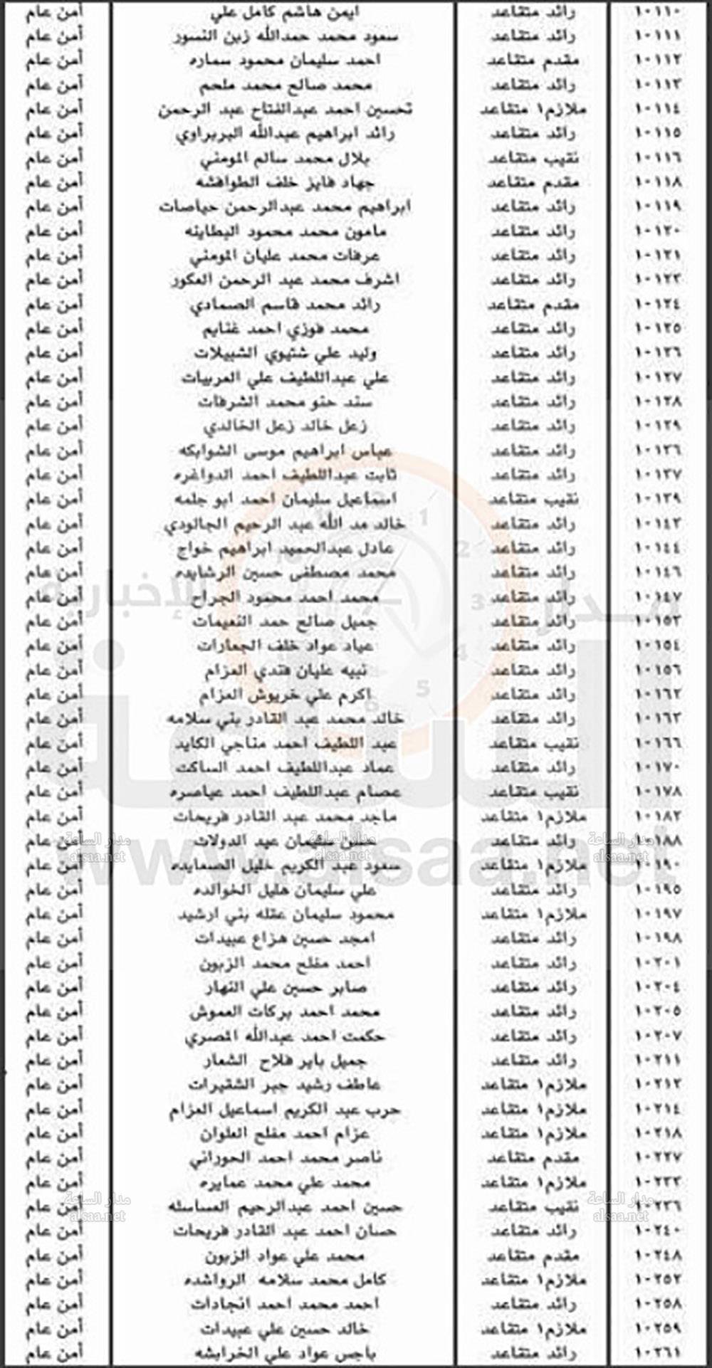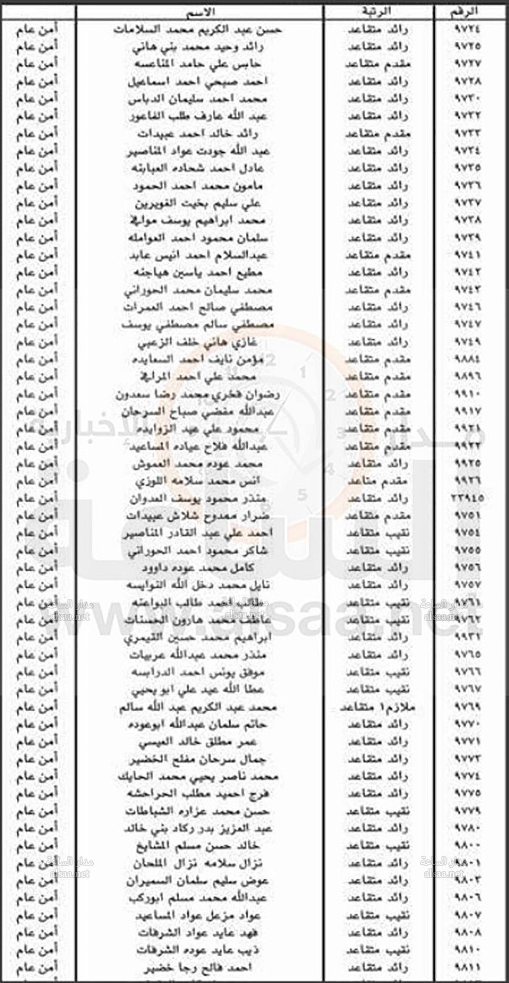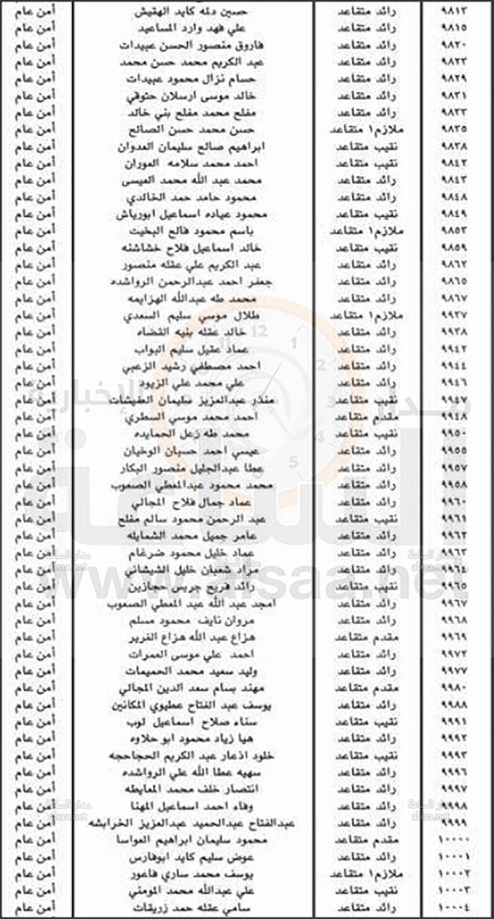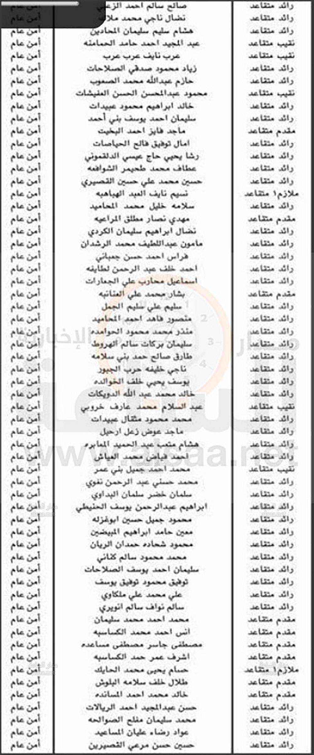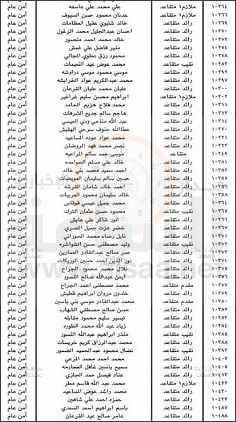 : بالاسماء... الأمن العام يعلن أسماء 600 ضابط متقاعد "أمن عام ودرك دفاع مدني " شملتهم المكرمة الملكية التالية :
